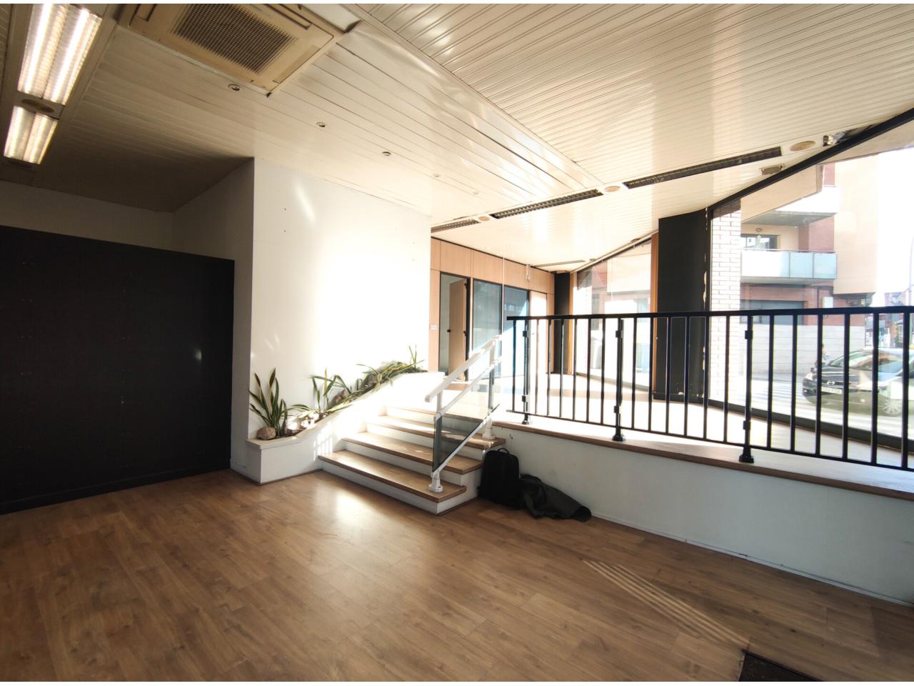 Local comercial seminuevo de 160m2 esquinero con 2 grandes escaparates, y puerta eléctrica con seguridad. El local es totalmente diáfano con dos divisiones de oficinas y cuarto de baño, las oficinas tienen la preinstalación de aire acondicionado y soporte exterior para colocar el motor. El baño es completo y tiene un pequeño cuarto donde se podría utilizar como vestidor, o trastero. Tiene suelos de parquet, un escalonado a doble altura para poder ir a oficinas y la carpinter